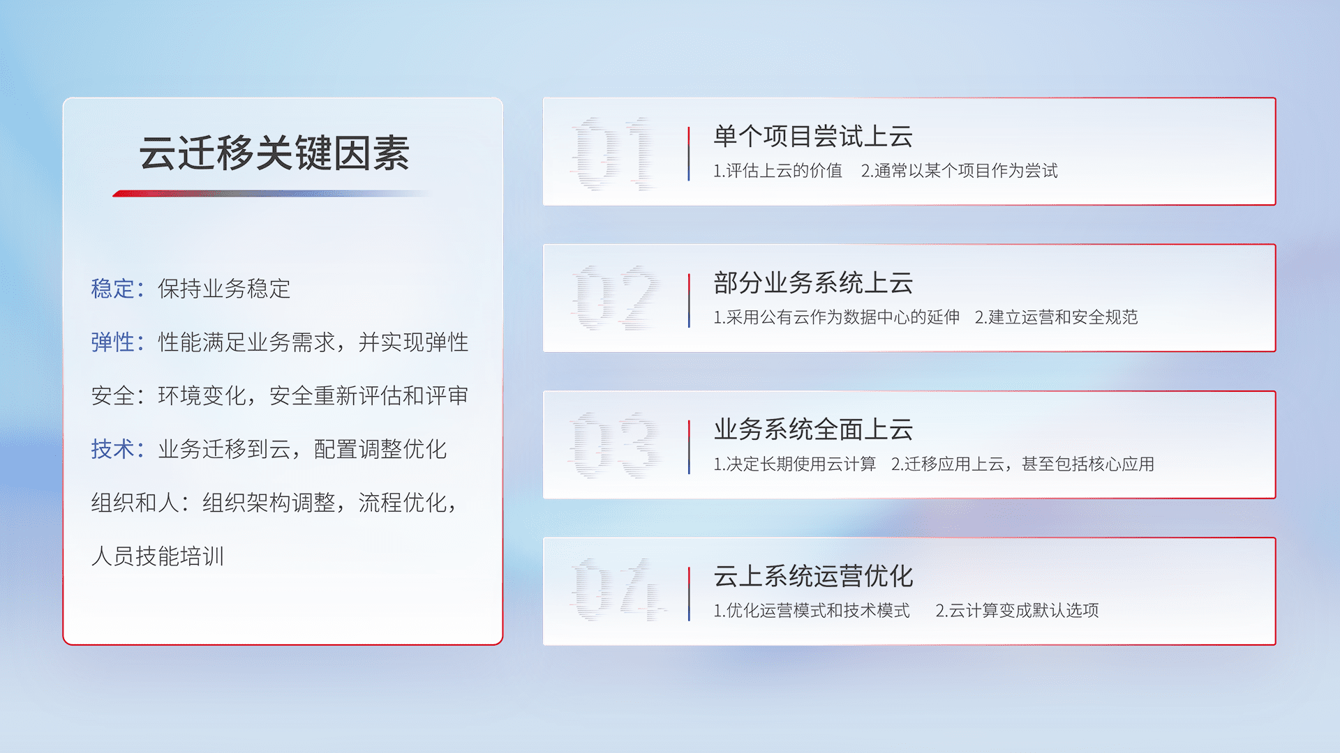 结合实际业务,,,,从规划设计、、云平台选型、、云原生改造、、、、数据迁移、、、集成交付,,迁移全过程为客户识别最佳上云路径,,,做好风险识别管理,,,设计网络架构、、、身份权限、、、、安全审计合规、、、操作审计、、日志审计、、、监控告警策略、、多站点容灾设计等,,,,对云上基础设施进行整体规划,,,提升IT治理水平,,,,以满足弹性、、高可用、、、高性能的需求。。。