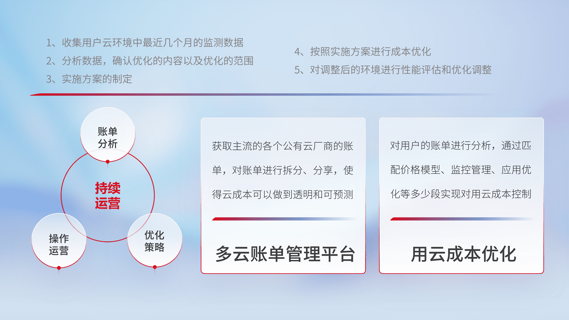 通过多云纳管,,以统一的资源数据模型把客户的云资源进行抽象和封装,,,,进而实现对多云资源的统一操作,,,,保障云资源管理的可靠性、、、稳定性与可用性。。。量身定制化运维内容,,,,配置、、、开发运维、、补丁管理、、、备份、、监控、、认证和访问管理、、、审计和日常巡检等,,,,保障在用云过程中的可靠度,,,,稳定度以及高可用率。。。。