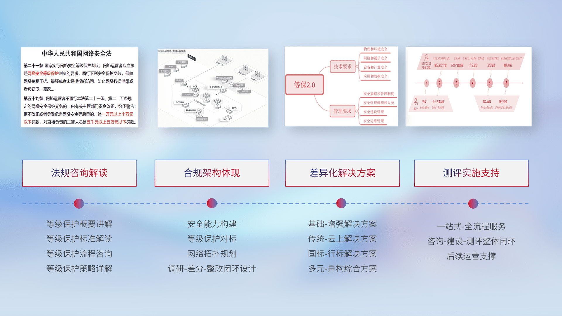 通过专业的法律咨询解读、、合规架构体现、、差异化解决方案、、测试实施支持等服务,,,,为客户量身打造等保合规体系。。。